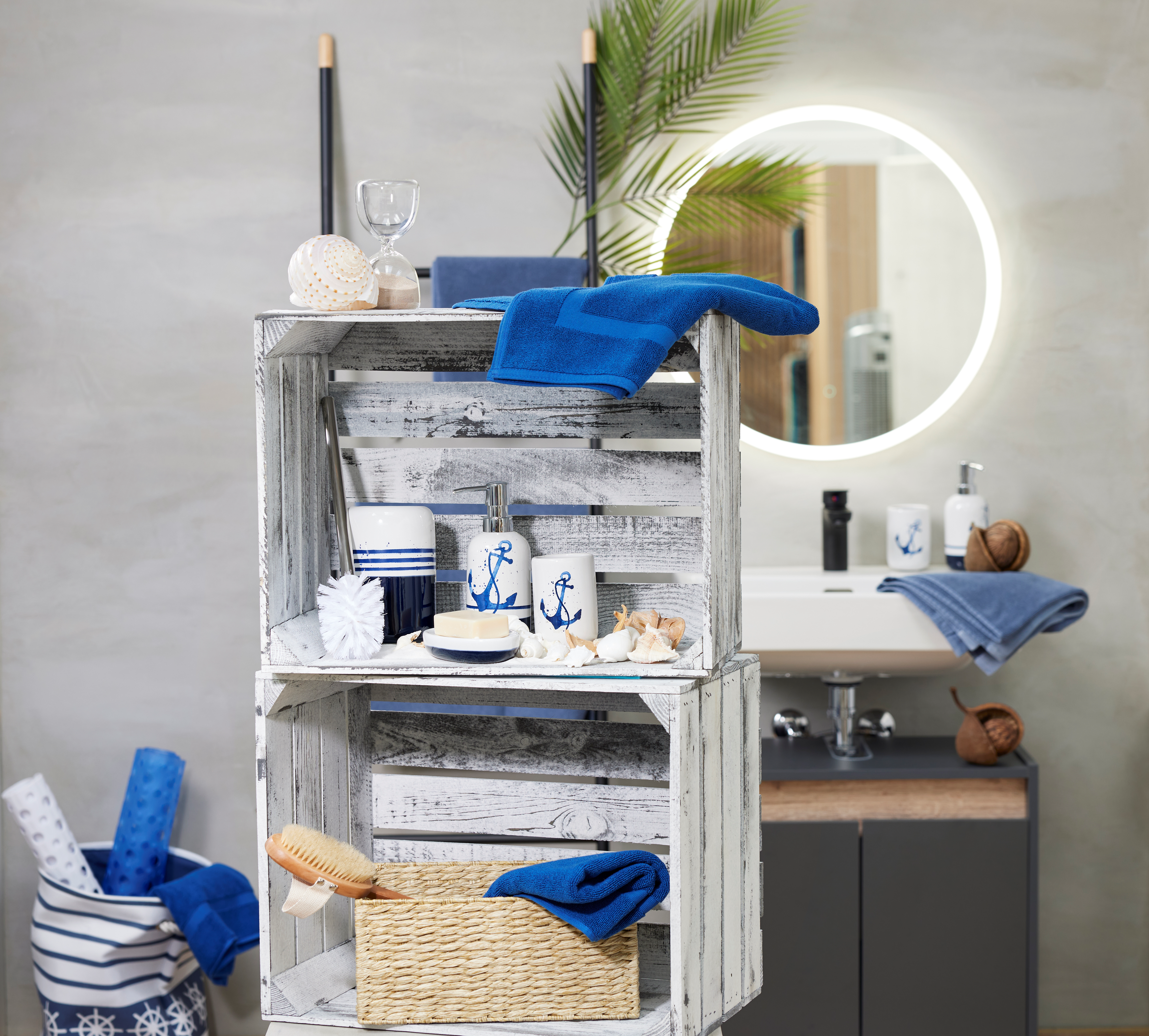 Diese Farbe bringt schon am Morgen Ferienlaune ins Bad. Textilien mit maritimen Elementen wie Anker, Steuerrad und Blockstreifen kontrastieren schön mit jedem weissen Badezimmer. Dazu passende Badematten und unterschiedlich blaue Frottiertücher ergänzen den Look. Einen edlen Touch bekommt das Badezimmer mit weisser Keramik oder passenden Accessoires.